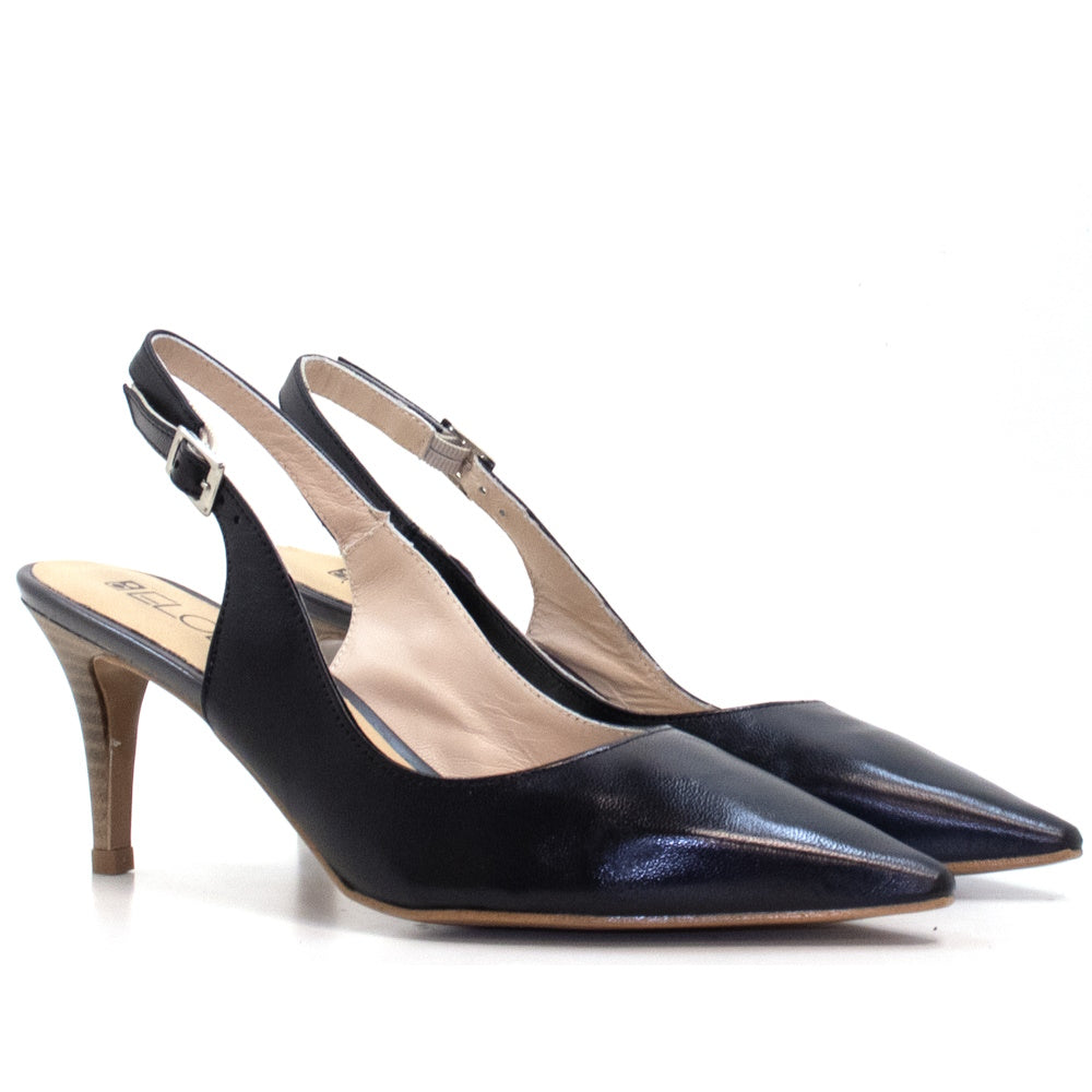 El Zapato de Salón Amelie en piel napa negro destaca por su diseño destalonado que aporta frescura y modernidad a un clásico atemporal. Su cierre de hebillas garantiza un ajuste perfecto y añade un toque delicado y sofisticado. Con un tacón de 75 mm, este modelo estiliza la figura mientras mantiene comodidad para un uso prolongado. Fabricado en piel napa de alta calidad, suave y flexible, envuelve el pie con un acabado impecable. El color negro profundo lo convierte en una pieza versátil, ideal para combinar con looks formales o casuales. Fabricado 100% en España, refleja la tradición artesanal y el cuidado en cada detalle para ofrecer un calzado elegante, cómodo y duradero.