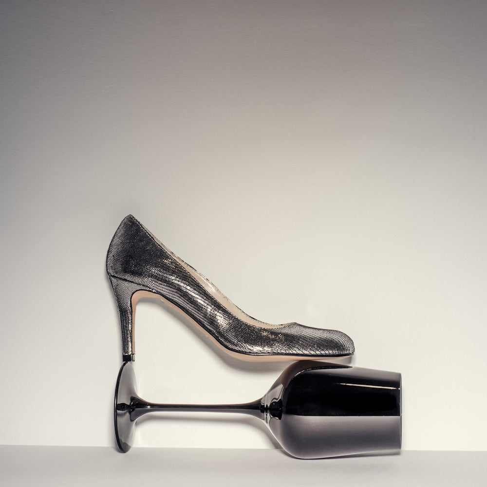 SALON OTILIA PUNTA REDONDA FABRICADO EN PIEL GRABADA PLATA CON TACON DE 70mm